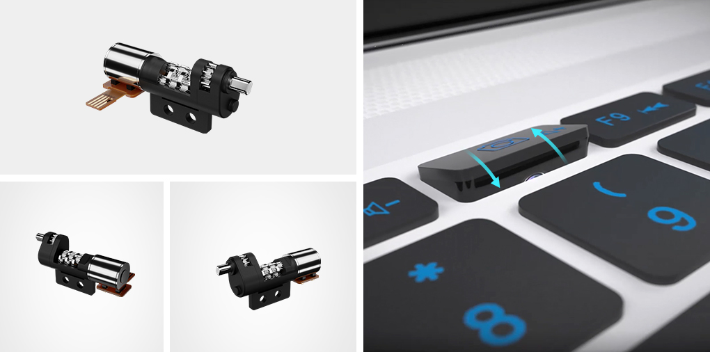 據(jù)了解,隨著筆記本逐步的輕薄化,也有廠商開始追求極致的輕薄,追求極窄邊框,因此需要縮小屏幕周圍邊框,然而這正是大多數(shù)電腦攝像頭的安裝位置。為此,兆威別出心裁,開發(fā)出一款帶翻轉(zhuǎn)功能的隱藏式攝像頭驅(qū)動(dòng)系統(tǒng),利用緊湊的微型驅(qū)動(dòng)結(jié)構(gòu),可以在有限的空間內(nèi),輸出較大力矩,使得攝像頭平時(shí)處于隱藏狀態(tài),當(dāng)需要時(shí)候,只需要按下鍵盤即可一鍵彈出。